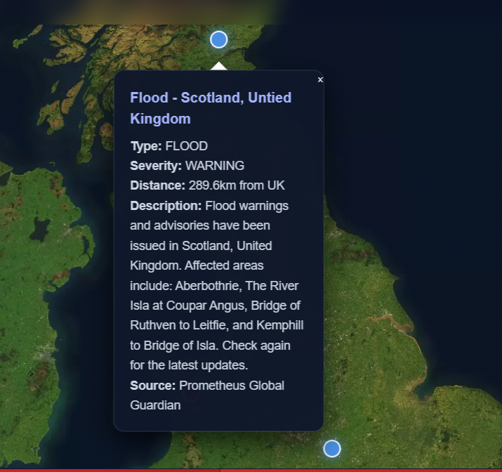 With active hazard detection spanning a 500 km radius and powered by multi-source, validated data fusion, the platform marks a leap forward in environmental risk intelligence. Flooding has been confirmed as the highest current national threat, with persistent storm and winter weather conditions escalating infrastructure and safety risks.